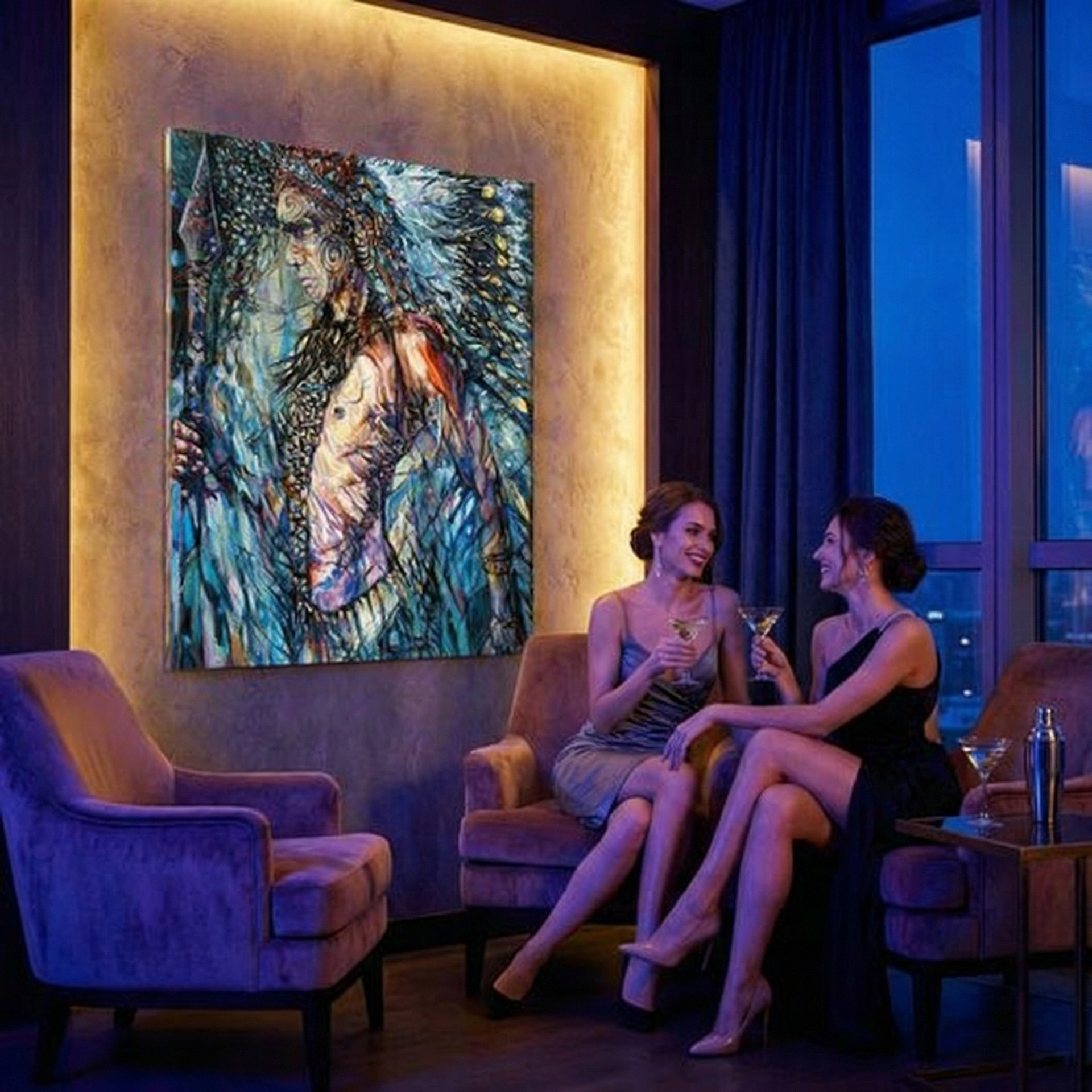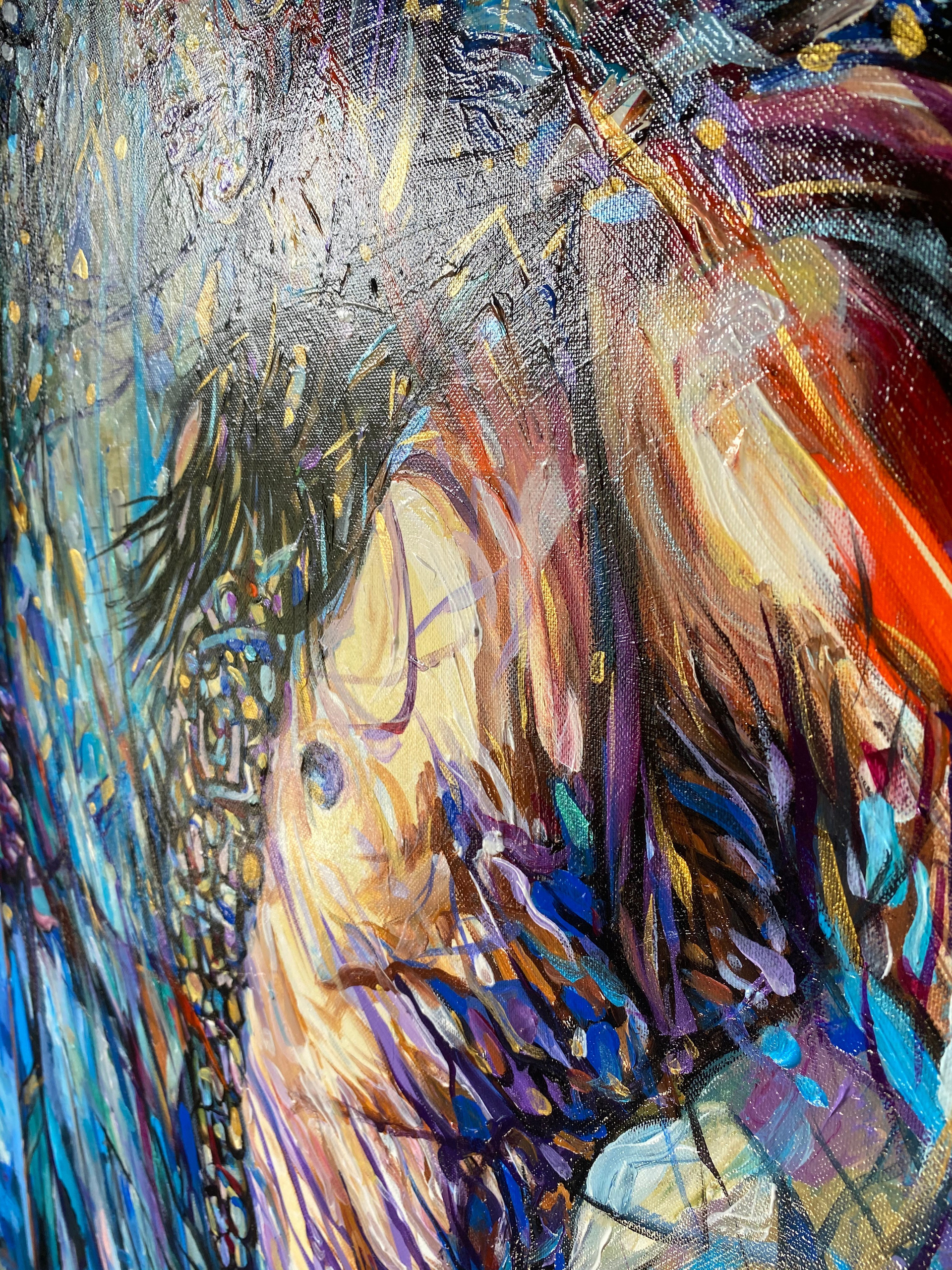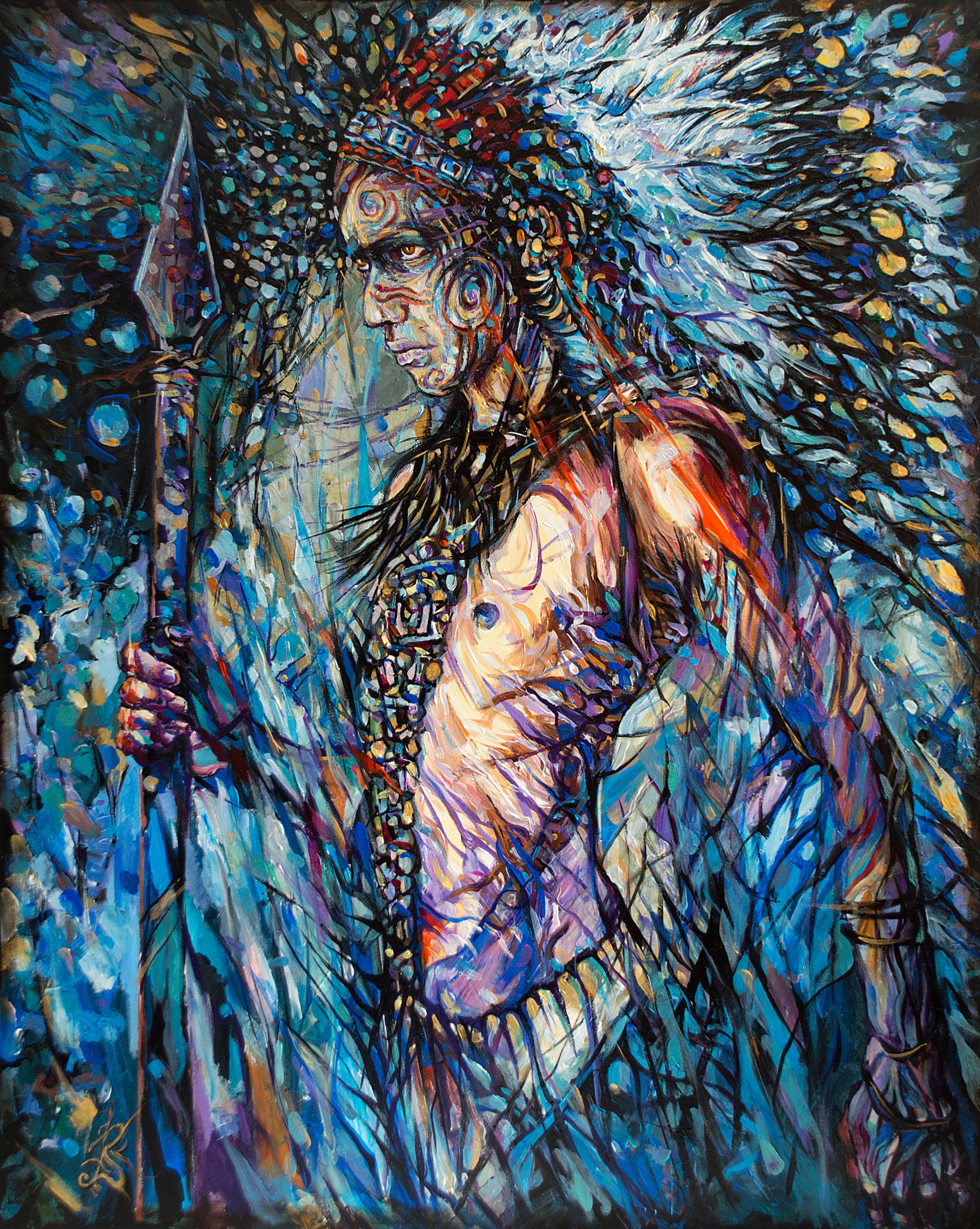 Перо и копьё — не только символы войны и защиты, но орудия проникновения в тайны. Украшения и узоры на теле отсылают к ритуалам, к сакральным значениям, где каждая линия — личная легенда, часть великого Космического Танца. Голова, увенчанная венчиком перьев, становится антеной, улавливающей энергии иных планов бытия. Сквозь сложную игру синего и золотого света прорывается нечто большее, чем человеческая суть — дух, способный чувствовать ткань мироздания.