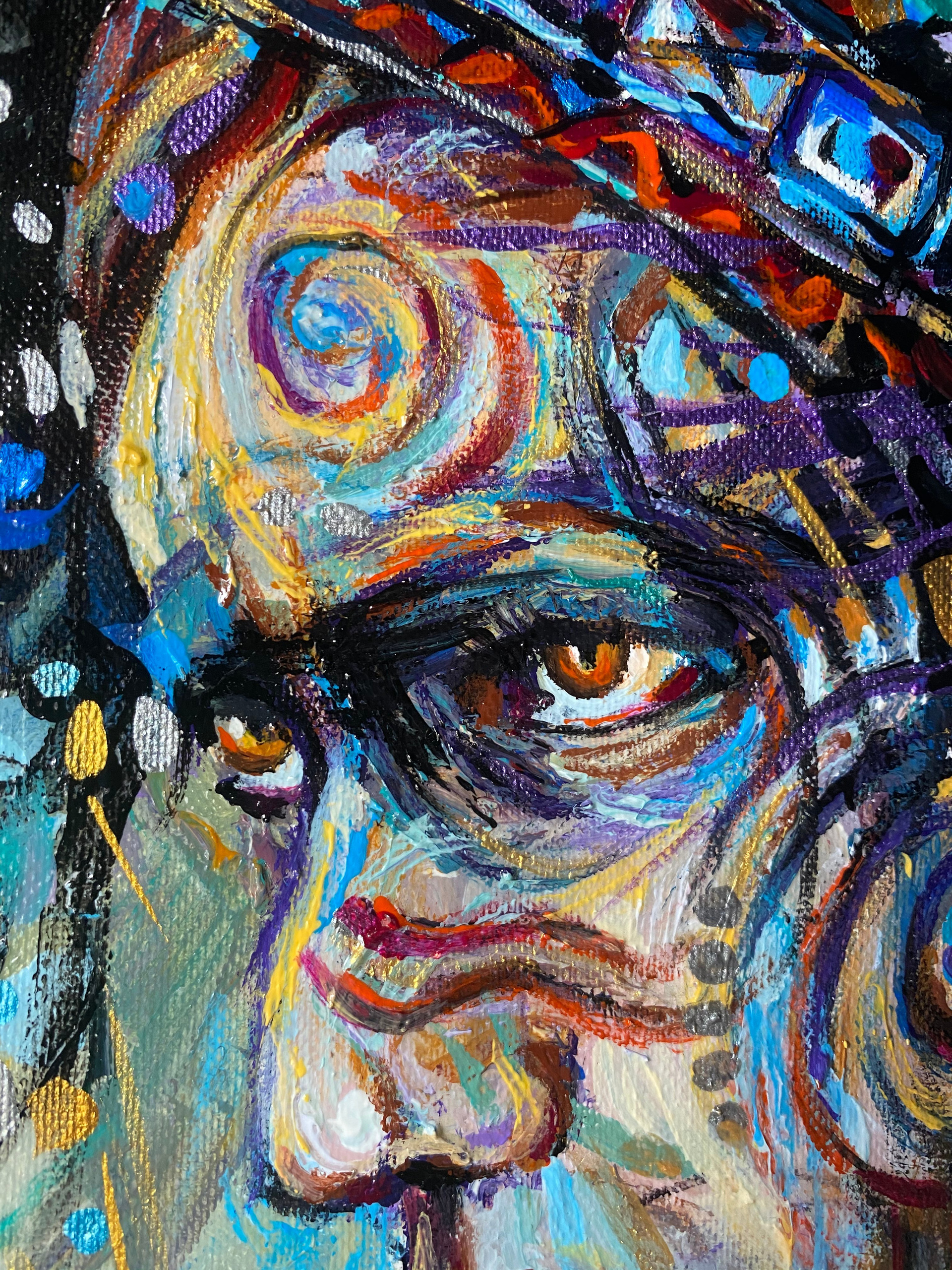На этой картине перед нами раскрывается не просто человеческий облик, а образ шамана — проводника между мирами, хранителя древних знаний и незримых связей. Его взгляд устремлён внутрь себя и далеко за пределы видимого, отражая безмерную глубину, с которой воспринимается Вселенная. Словно ручей энергии, пронизывающий всё бытие, его мысли и ощущения вплетаются в волны цвета и света, превращая привычный облик в галактику мистерий.