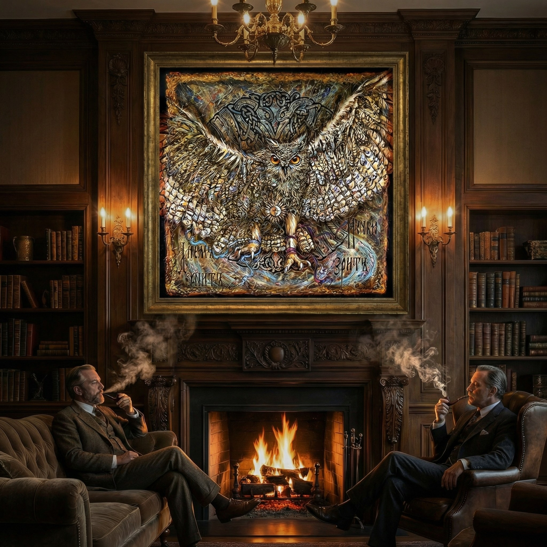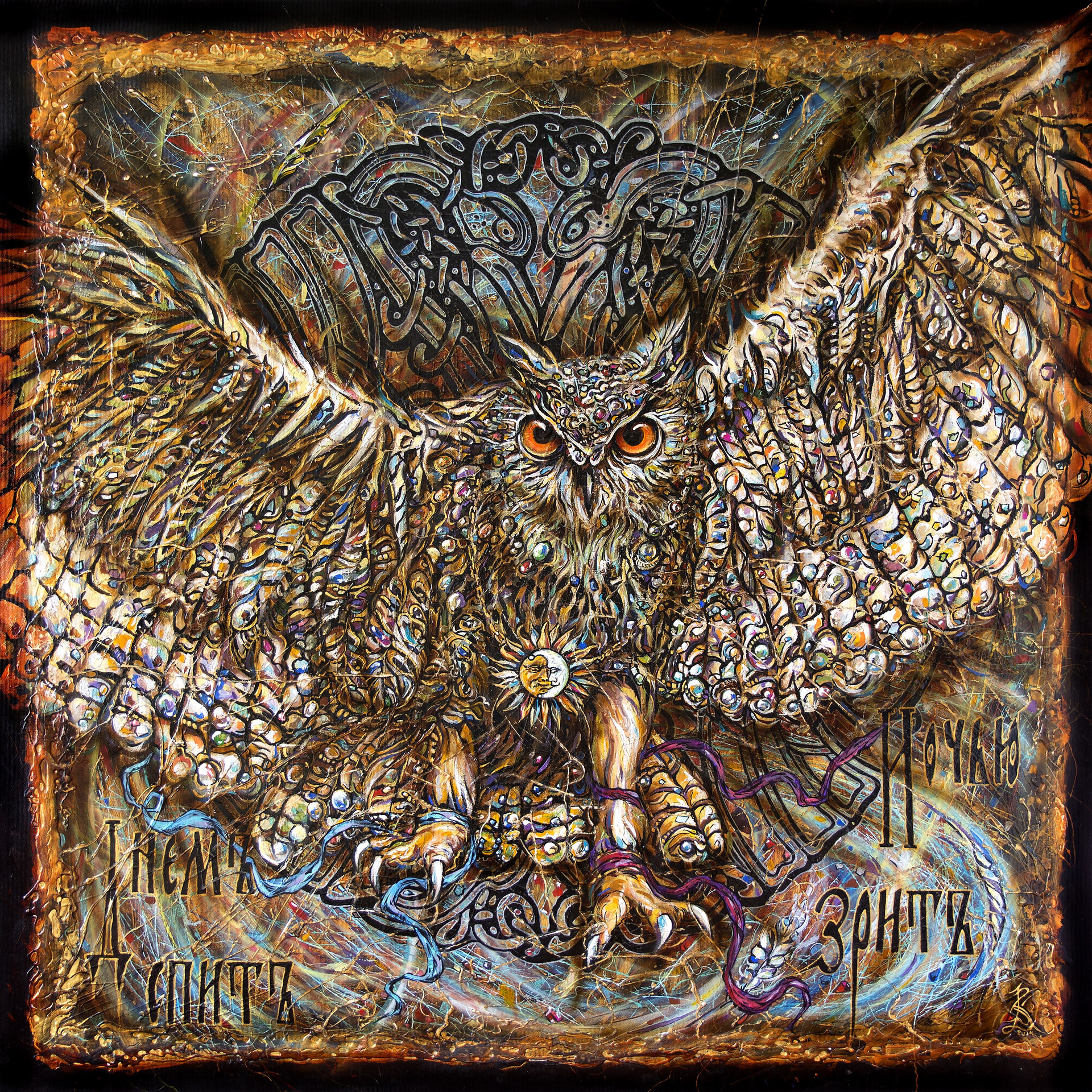 Картина «Днём спит, ночью зрит» — аллегория вечной мудрости и глубинного знания, сокрытых в тенях человеческого бытия. Сова, расправившая крылья, стоит на границе двух миров: осознанного и потаённого, дневного сна и ночного прозрения. Её пронизывающий взгляд светится в темноте — словно две искры всевидящего ока, незримого стража тайн мироздания.
