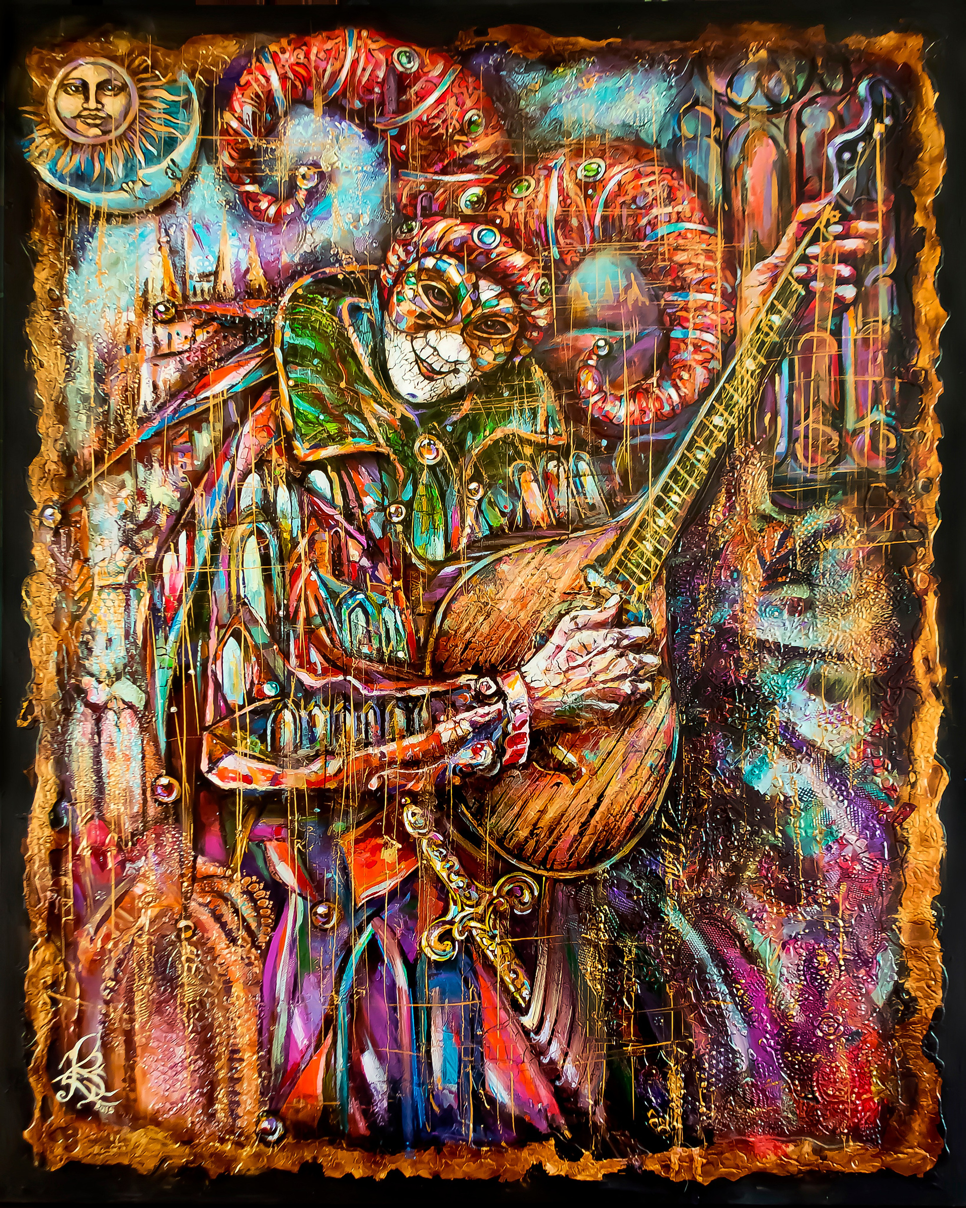 Завитки и орнаменты, будто символы древних загадок Вселенной, оплетают пространство вокруг, приглашая зрителя задуматься о природе игры и лицедейства в человеческой жизни. Маска на лице арлекина — напоминание нам о множественности наших ролей и вечном поиске собственного «я» под этим вечным лунным светом.