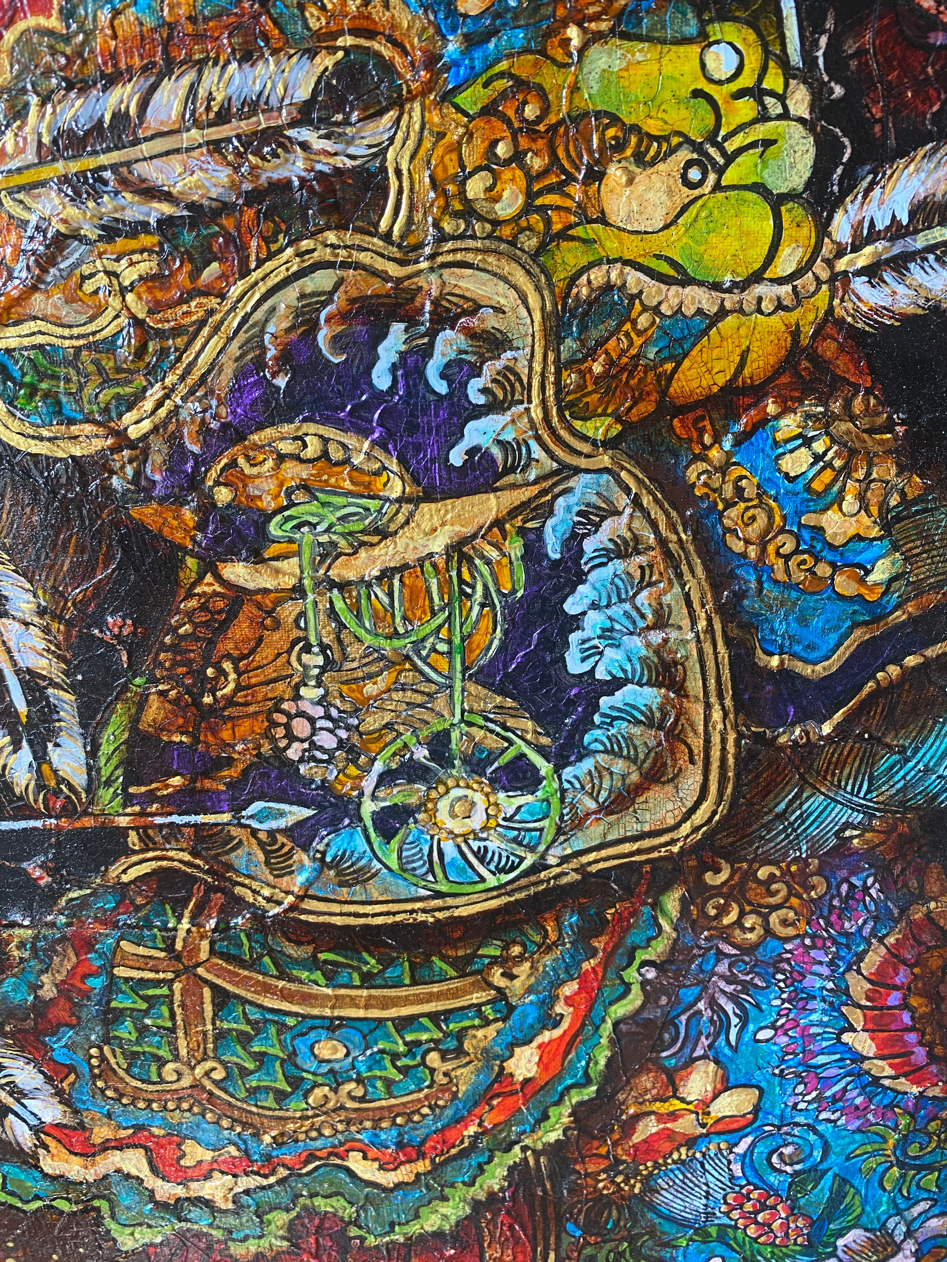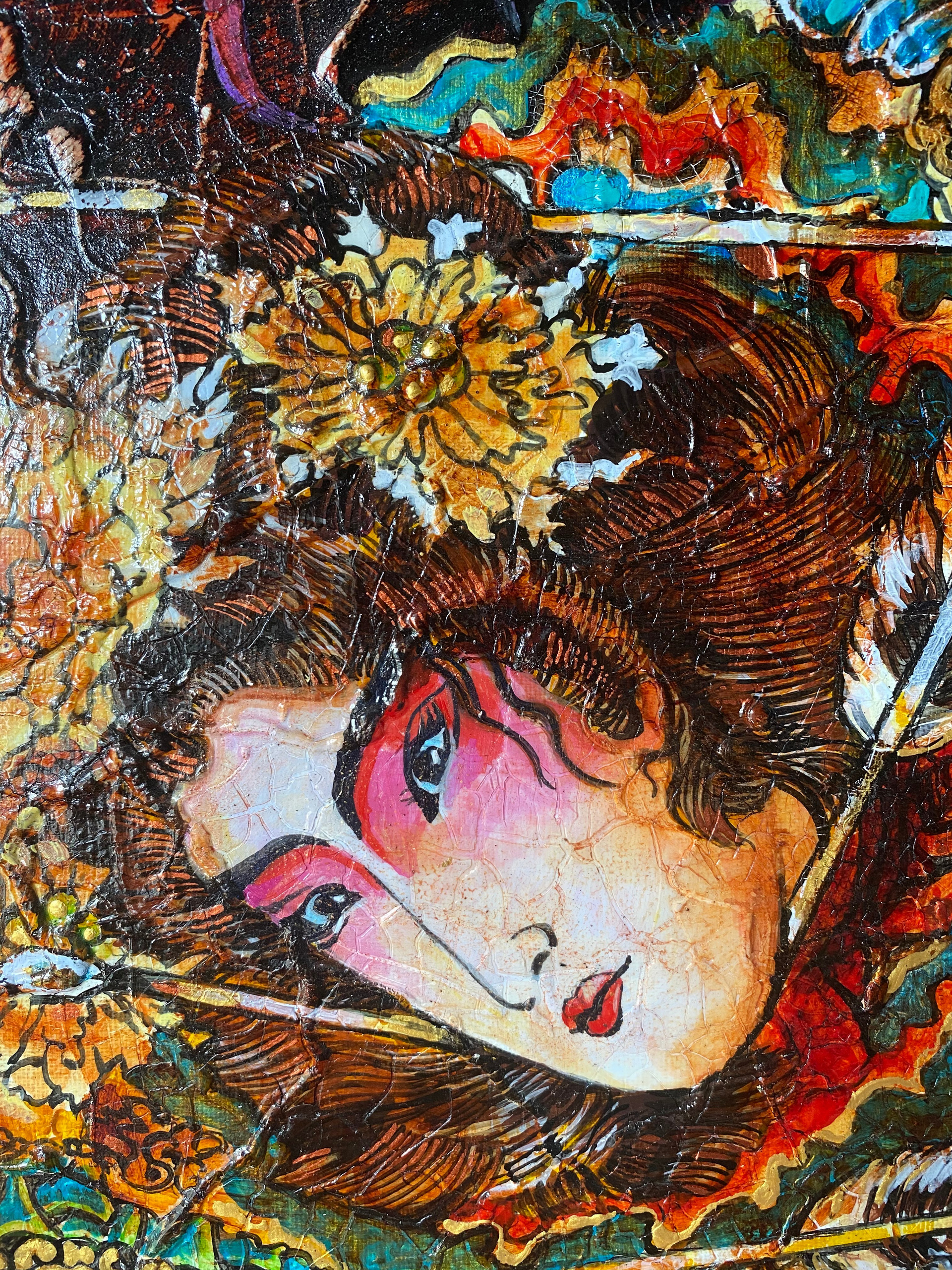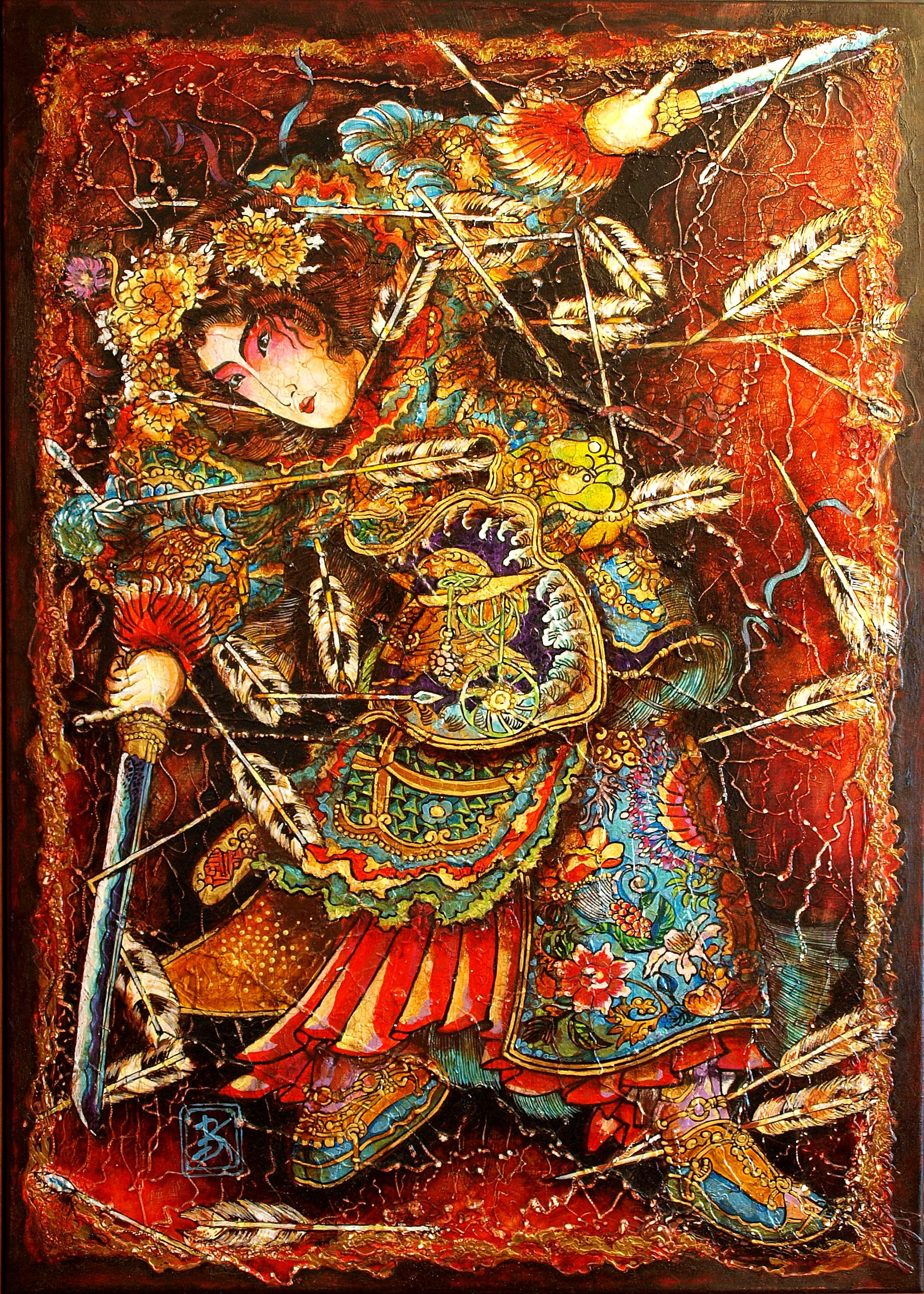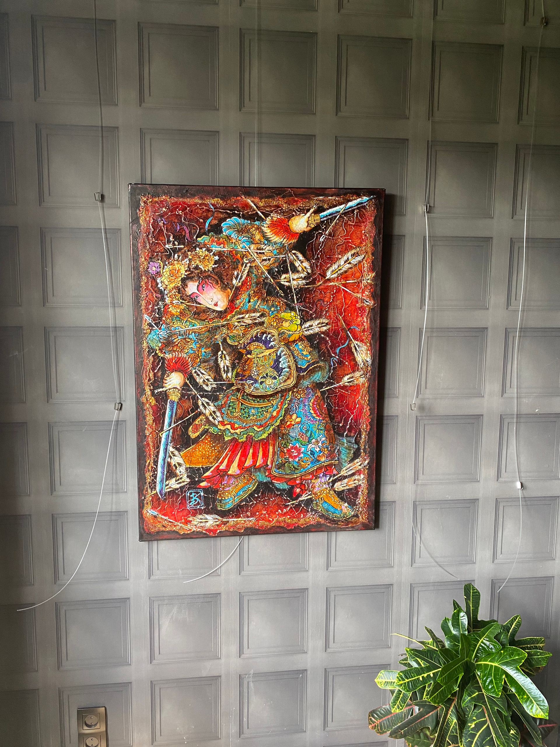 Огненно-красный фон картины — это полотно страстей, эмоций, вечной борьбы за себя и своё право быть. Богатство орнаментов и цветочных мотивов на доспехах напоминает: даже в самой ожесточённой битве женщина способна сохранить внутреннюю гармонию, грацию и творческое начало.