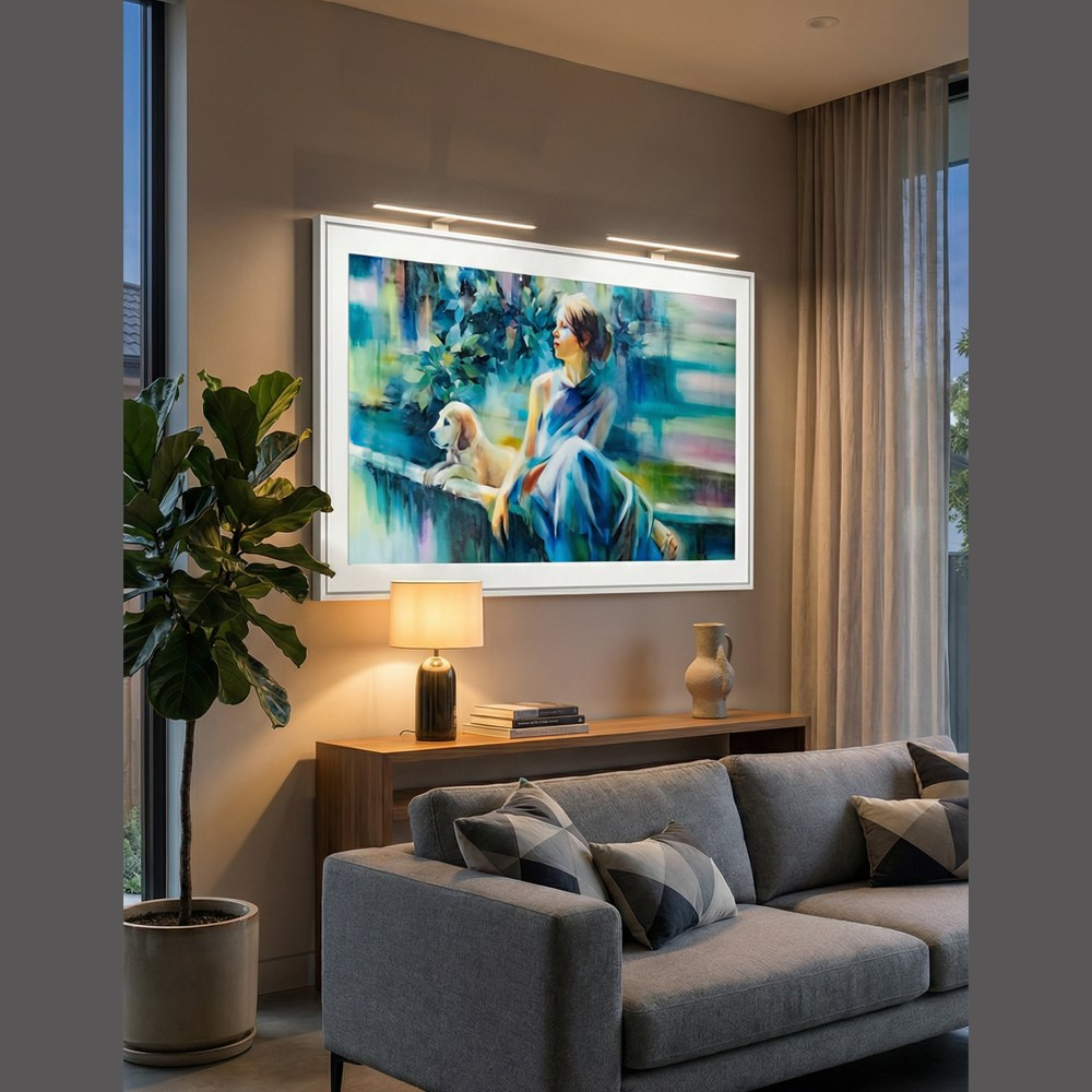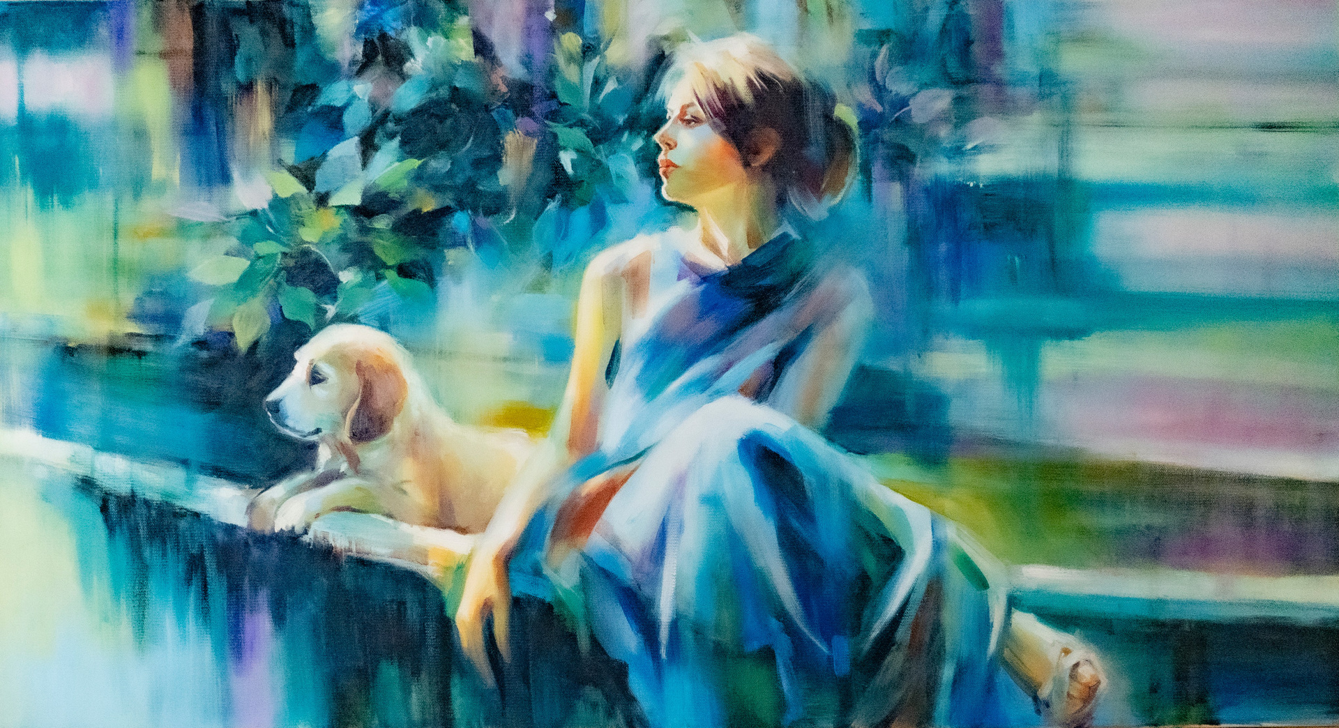 Полупрозрачные мазки, легкая игра света и оттенков погружают зрителя в мечтательное, почти медитативное состояние. Работу отличает изысканная цветовая гамма: переливы голубых, бирюзовых и золотистых тонов наполняют сюжет внутренней гармонией и светлой меланхолией.