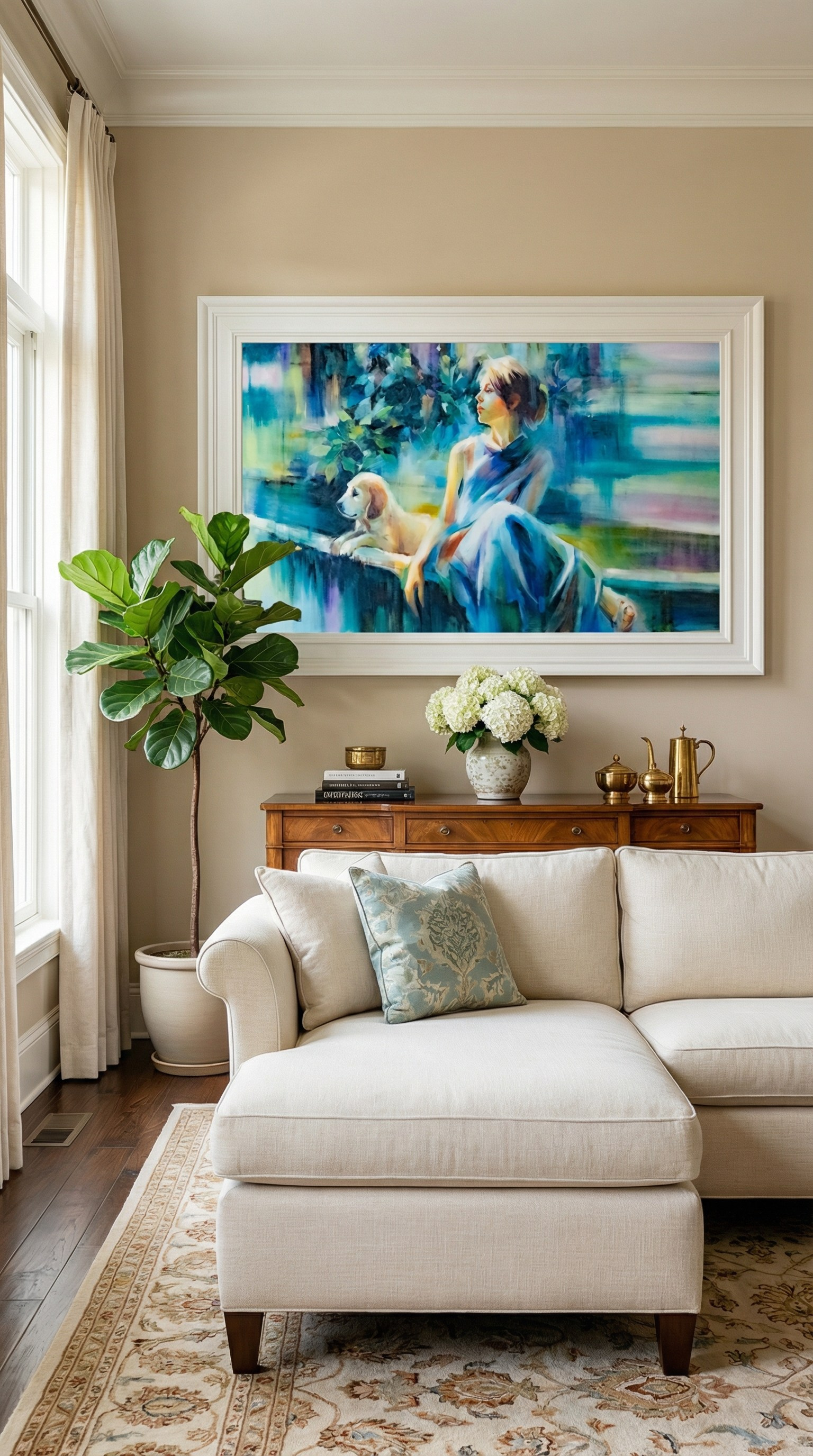 Лиричная и эмоциональная картина «Ждать» — это одновременное воплощение тишины и ожидания, наполненного светлой надеждой. Теплый женский образ и преданный взгляд собаки, запечатленные в мягкой солнечной дымке, создают тонкую атмосферу доверия, спокойствия и тесной связи между человеком и животным.